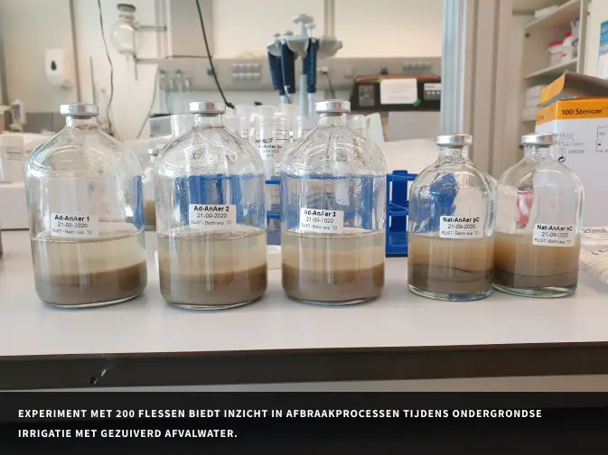 ‘Dat weten we voor deze omstandigheden nog niet precies. Zandgronden, zoals de duinen of rivieroevers, worden al gebruikt voor waterzuivering. Afbraak gebeurt daar veelal onder sub-aerobe omstandigheden, waarbij zuurstof beschikbaar is. Onze proefopstelling had voornamelijk anaerobe omstandigheden, waarbij nauwelijks zuurstof beschikbaar is. Dat kan andere afbraakproducten veroorzaken, die we nog niet kennen. Vervolgonderzoek moet uitwijzen welke dat precies zijn. Het is ieder geval duidelijk dat lang niet alle stoffen afbreken. PFAS blijft bijvoorbeeld gewoon in het water zitten, daar komen we niet vanaf met ondergrondse irrigatiesystemen.’