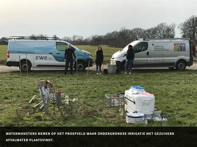 ‘Ten eerste hebben we onderzocht of ondergrondse irrigatie effectief is, omdat je het water in de bodem injecteert in plaats van dat je het op de plant sproeit. Hiervoor hebben we de drainagebuizen gebruikt die er al lagen, op ongeveer een meter onder maaiveld, waar ook ondiep grondwater zit. Door water toe te voeren in zo’n systeem is er sprake van omgekeerde drainage, ofwel ondergrondse irrigatie. Zo konden we tijdens het droogteseizoen het ondiepe grondwater aanvullen. Ten tweede waren we geïnteresseerd in wat er zou gebeuren met de ongezuiverde stoffen uit het afvalwater, die mogelijk een risico vormen als ze in de wortelzone van het gewas terechtkomen of in het diepere grondwater.’